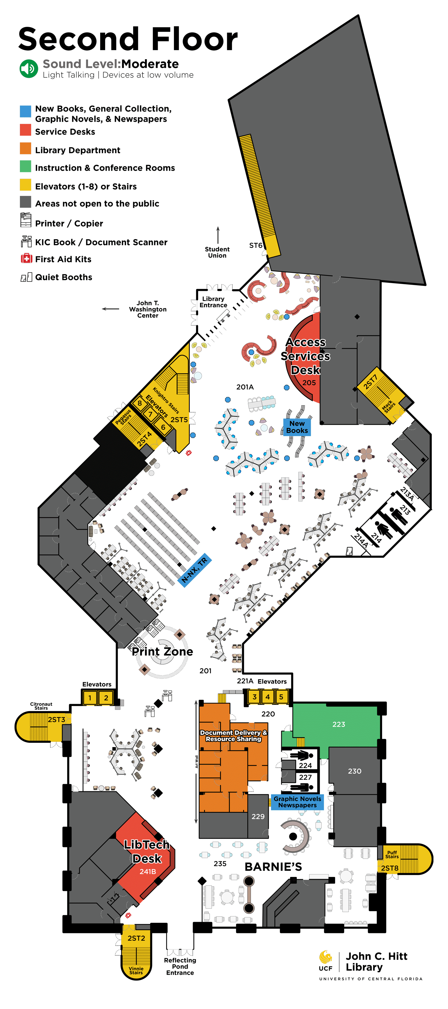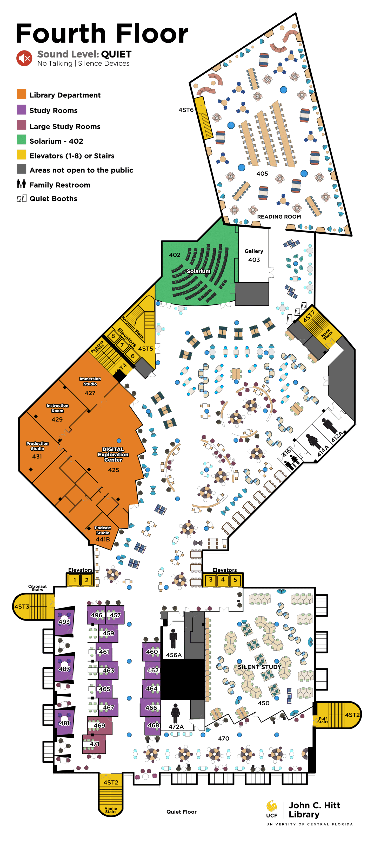 The John C. Hitt Library [named for our university president on the occasion of his 20th anniversary at UCF is under the leadership of Dean of Libraries Beau Case and offers a variety of space options for students: individual and faculty/graduate student study rooms; a presentation practice room; two library classrooms; quiet study floors; Infusion Café; Knowledge Commons (24,800 square foot learning and technology environment providing seating for 479 undergraduate and graduate students; 196 desktop PC stations; 116 seats with 110v power within easy reach; 167 additional seats in differing configurations including tables, upholstered chairs with tablet arms, soft seating, and group study settings; and portable whiteboards); and a variety of exhibit spaces on the 2nd and 5th floors.